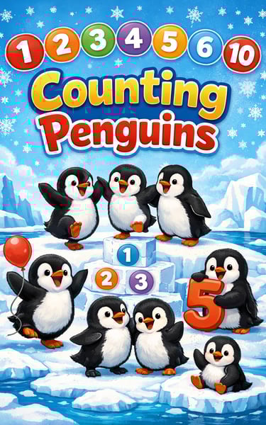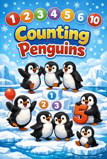 Counting Penguins is a fun early learning book for young children that teaches counting from one to ten with cute penguins and simple, playful pages. Each number is paired with cheerful illustrations to help kids practice counting, number recognition, and page-by-page discovery.
